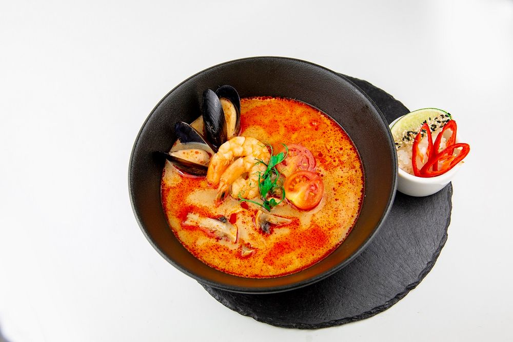 Пикантный тайский суп на основе куриного бульона с морепродуктами (мидии, кальмар, креветка, лосось)