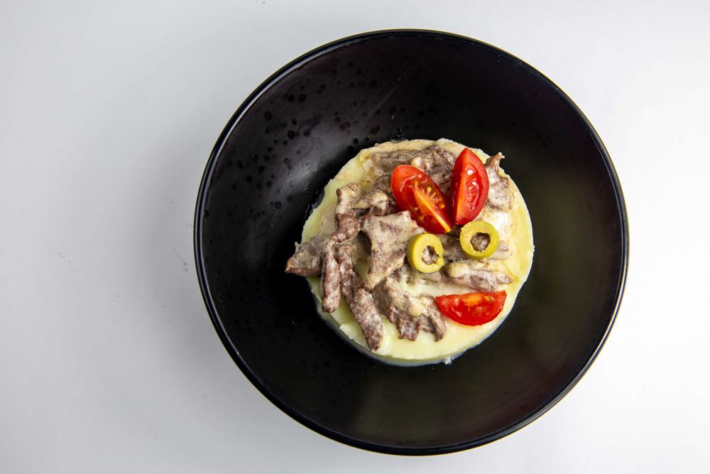 Телятина тушеная в сливочном соусе, подается с картофельным пюре