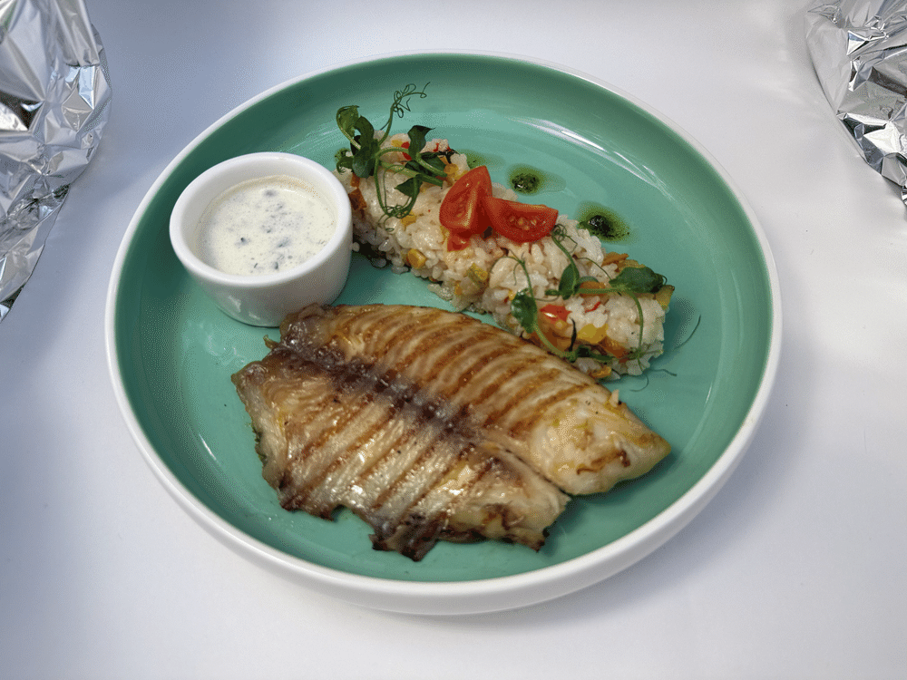Филе морского окуня на гриле, рис с овощами, соус тар-тар