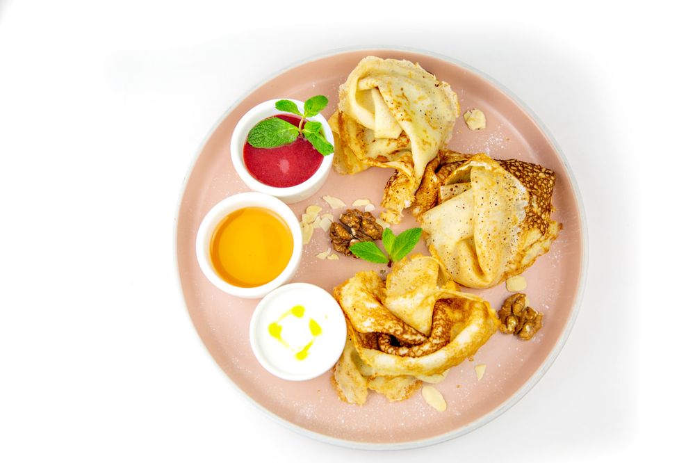 Блины со сметаной, медом, ягодным соусом