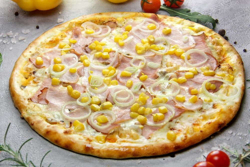 Сыр моцарелла, красный соус, свиная ветчина, бекон, шампиньоны, кукуруза, лук, пармезан