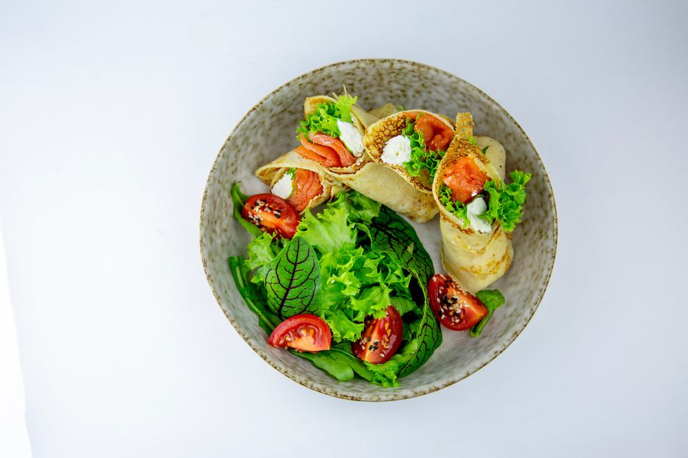 Блины со слабосоленым лососем, зеленью и сливочным сыром