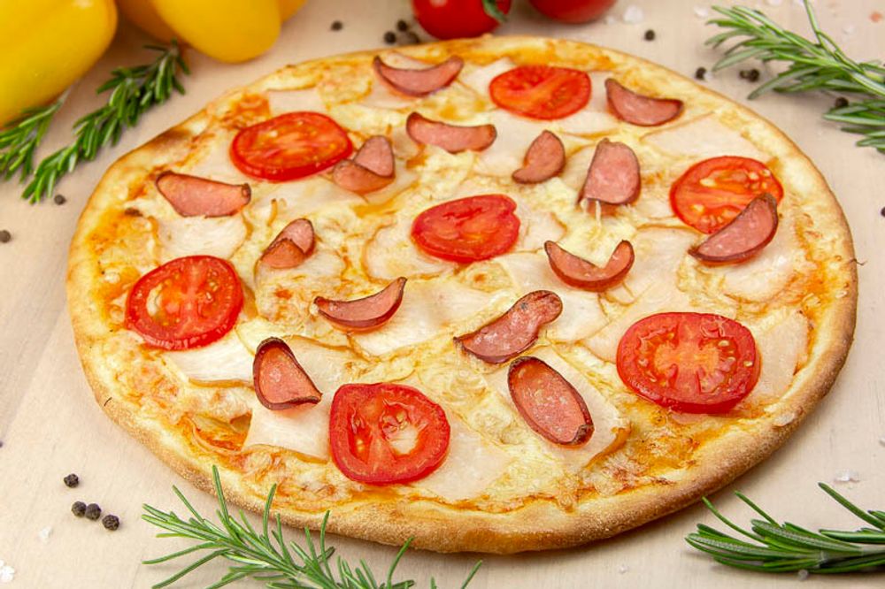 Сыр моцарелла, красный соус, копченые. колбаски, копченое куриное филе, помидор, пармезан