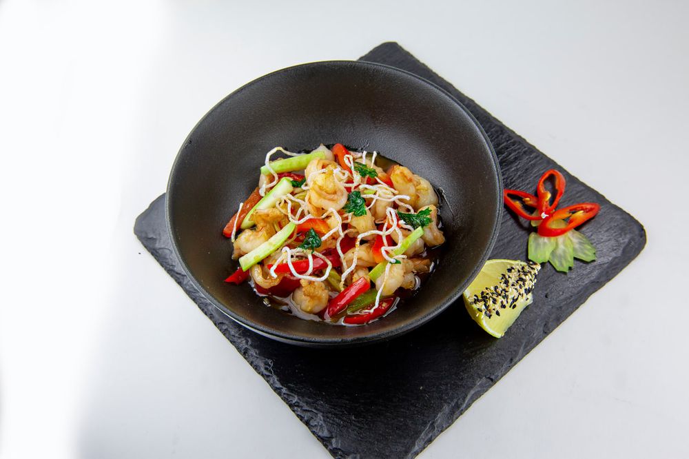 Королевские креветки в кисло - сладком соусе с овощами