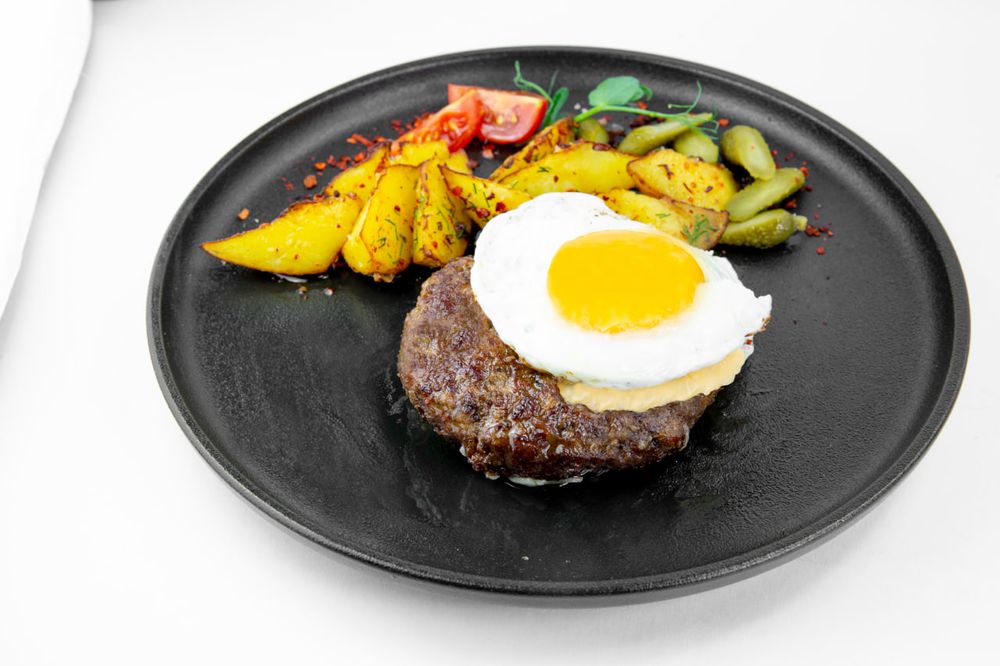 Рубленое филе говядины, сыр чеддер, яйцо. Подается с картофелем Айдахо и корнишонами