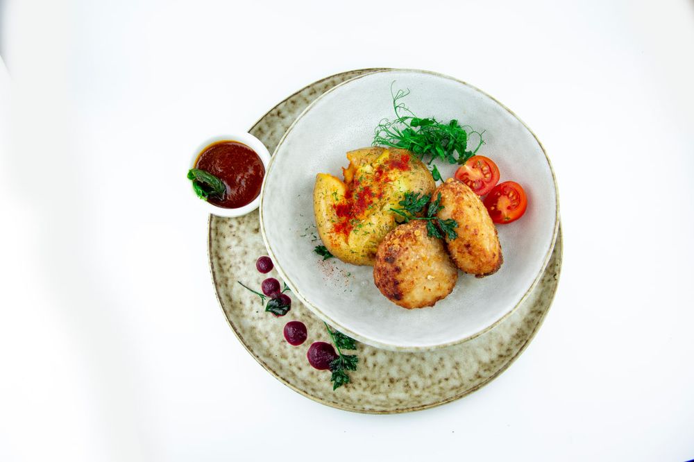 Подается с печеным картофелем и сливочно-грибным соусом
