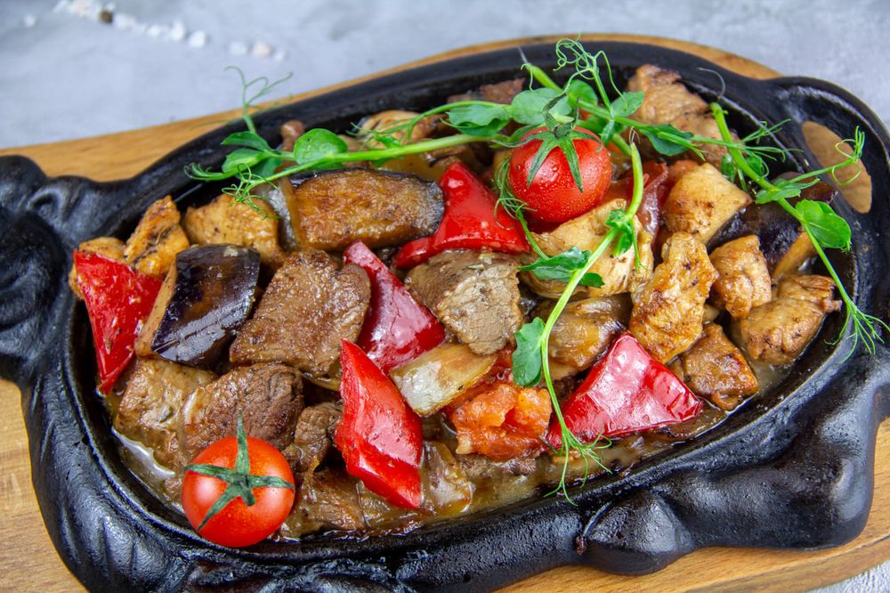 Телятина, свинина и куриное филе с овощами