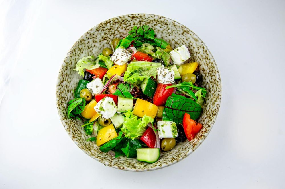 помидор свежий, перец гогошар, маслины, лук ялтинский, микс салата, пряный сыр фета, фирменная заправка