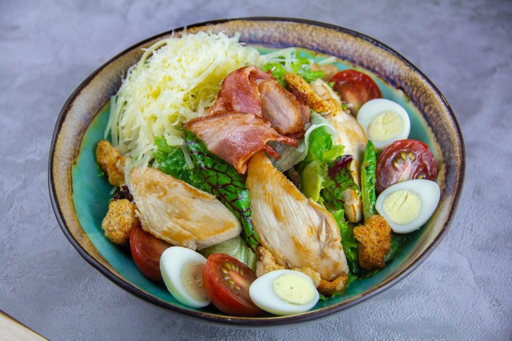 Обжаренное филе куриное, бекон, хрустящие сухарики, микс салата, перепелиные яйца, помидоры черри, соус «цезарь», пармезан