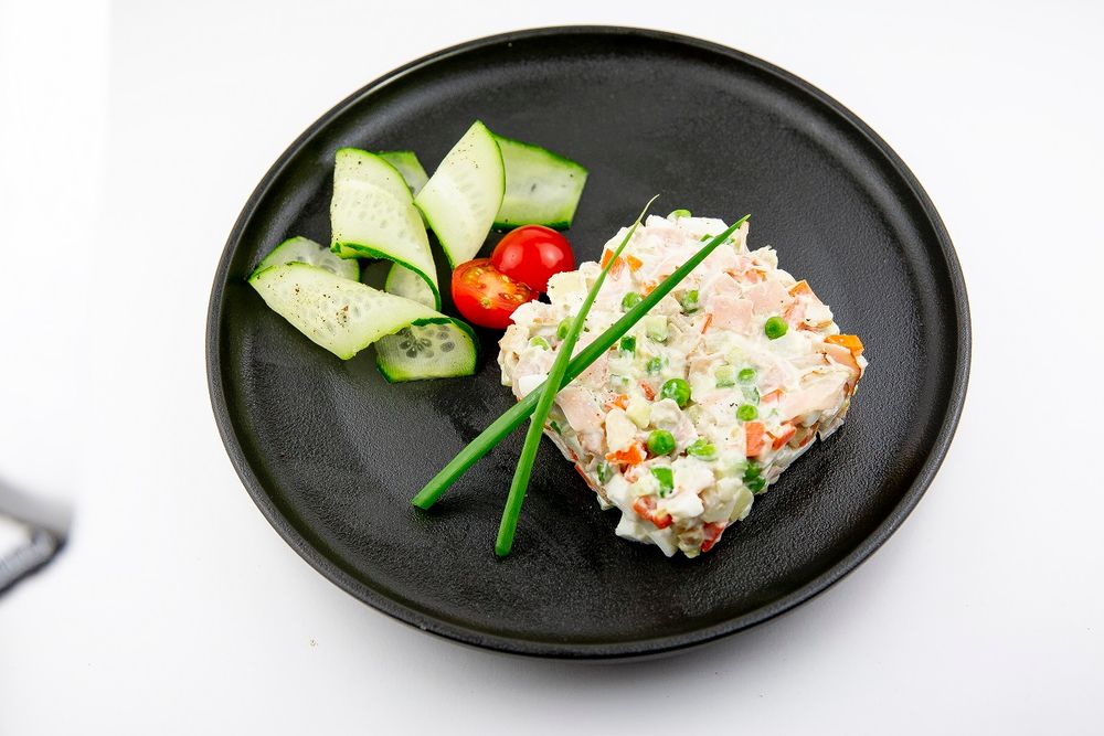 Говяжья ветчина, подкопченное куриное филе, зеленый горошек, морковь, картофель, лук ялтинский, яйцо куриное, фирменная заправка