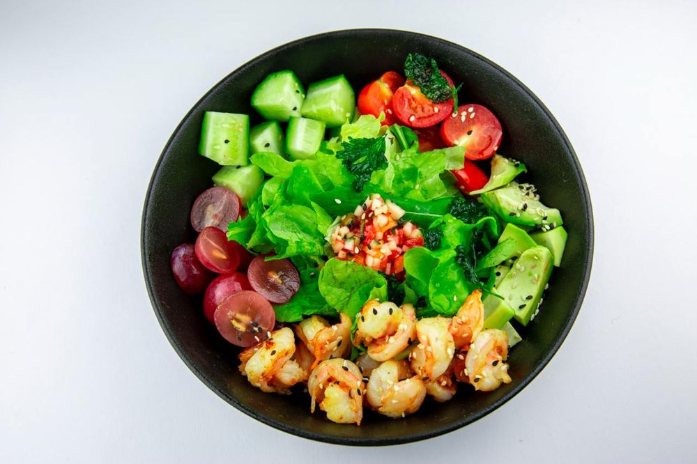 Тигровая креветка, авокадо, виноград, огурец свежий, микс салата, помидоры черри, соус сальса